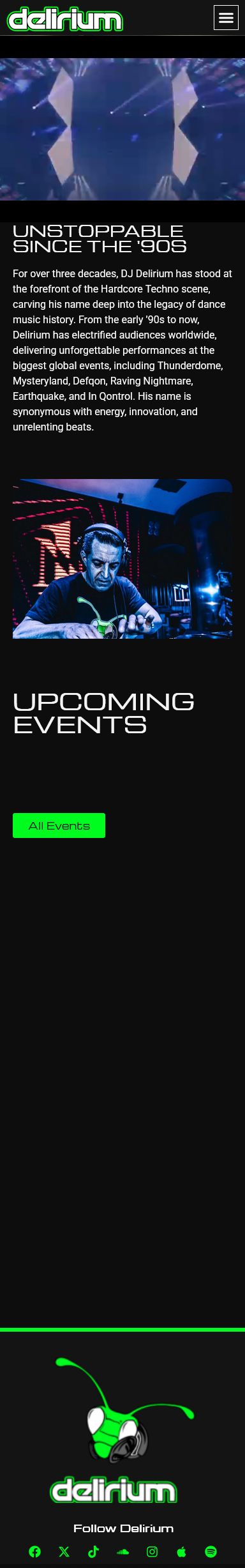 DJ Delirium is een pionier in de hardcore techno-scene, met meer dan drie decennia ervaring. Sinds de vroege jaren '90 heeft hij wereldwijd het publiek veroverd met onvergetelijke optredens op iconische evenementen zoals Thunderdome, Mysteryland, Defqon, Raving Nightmare, Earthquake en In Qontrol. Zijn naam staat synoniem voor energie, innovatie en onophoudelijke beats.